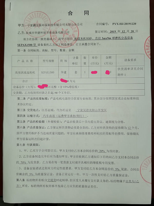 我司三年后與老客戶寧夏鵬昱新環(huán)保科技有限公司再次合作我司新型高效渦流選粉機(jī)SEPAX1500型,配套直徑3.0米球磨機(jī)使用。